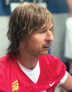 Designing Chad’s hair became a fluid, evolving process. From the beginning, we wanted Chad to feel like the polar opposite of Glen’s other character, Russ Holliday—who would be flashy, edgy, and styled with frosted tips. Chad needed to feel softer, more natural, and unmistakably southern. Working closely with Vincent Van Dyke and Sasha Camacho Van Dyke, we explored a range of colors and silhouettes before landing on what became Chad’s signature look: a warm “ginger biscuit” shade paired with a swooping side bang and a shaggy, razor-cut finish. The longer length and layered bangs gave the hair natural movement during drills and on-field antics, while the subtle mullet peeking from beneath his helmet added just the right amount of playful flair.