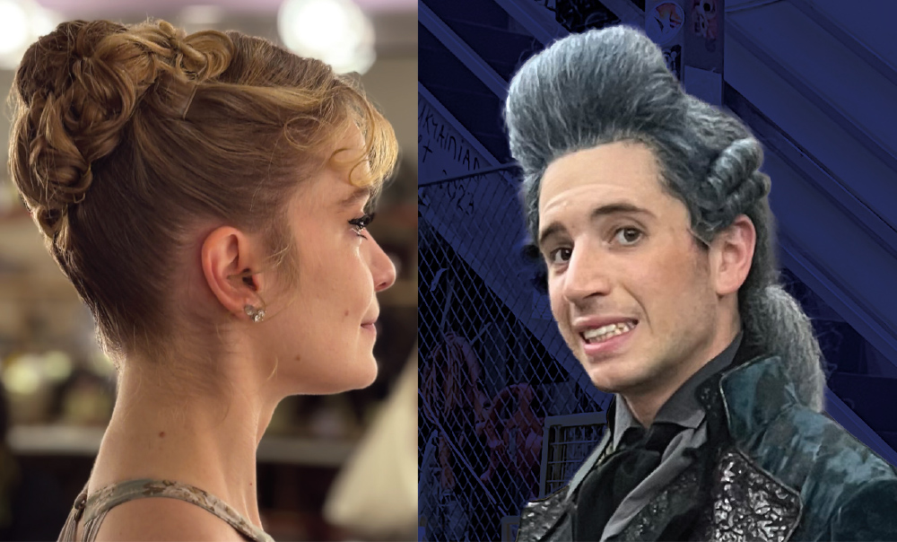 The women’s third look involves a set of more than 30 curled postiches in a range of colors and textures to match any possible casting rotation of dancers. The pieces are dressed in medium curls locked into place with pins and a fine hair net. We take down the pin curled sections, pin a postiche on top of the French twist, then iron a wave into the front pieces to dress back and blend with the postiche.