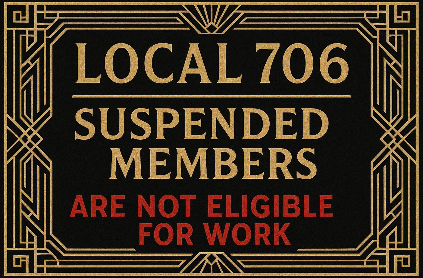 Notice Regarding Suspended Members: The individuals listed below, who are members of Local 706, are currently not eligible for work due to suspended membership status. These members are encouraged to contact the Local 706 office to arrange payment of any outstanding dues or assessments so that they may restore their membership to good standing and regain eligibility for employment.