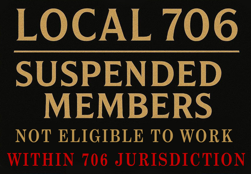Notice Regarding Suspended Members: The individuals listed below, who are members of Local 706, are currently not eligible for work within Local 706 jurisdiction due to suspended membership status. These members are encouraged to contact the Local 706 office to arrange payment of any outstanding dues or assessments so that they may restore their membership to good standing and regain eligibility for employment.